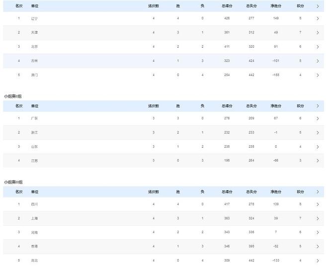 Ⅰ小组的小组第三名是北京队,去掉和小组垫底的澳门队比赛的净胜分后,北京队的净胜分是+31分;Ⅱ小组的第三名是山东队,这个小组只有四支球队,不用经过另外的计算,山东队的净胜分就是是0分;Ⅲ小组的的小组第三名是河南队,去掉和湖北队比赛的净胜分后,河南队的净胜分是-13分。也就是说,北京队和山东队是两个成绩最好的小组第三名,两支球队也携手晋级八强。